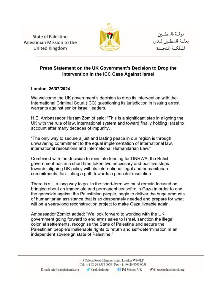 H.E. Ambassador Husam Zomlot said: “This is a significant step in aligning the UK with the rule of law, international system and toward finally holding Israel to account after many decades of impunity.